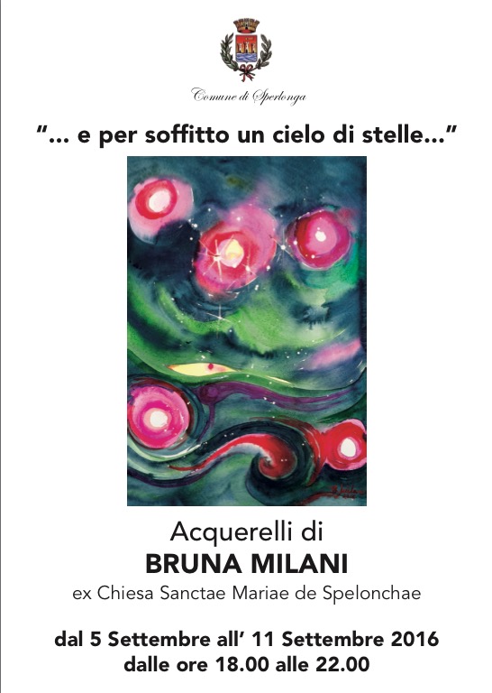 Due passioni, quella per il cielo in tutte le sue espressioni sia astronomiche che astrologiche, e quella per gli acquerelli: nasce così la raccolta di opere di Bruna Milani, in esposizione presso la ex chiesa Sanctae Mariae de Spelonchae dal 5 all’11 settembre.