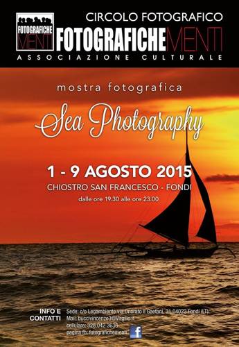 L’hanno rifatto ancora. Anche quest’anno i soci dell’associazione “Fotografichementi” propone la mostra fotografica a cura dei suoi soci. Da ogi, Sabato 1 Agosto, e fino a Domenica 9 il Chiostro San Francesco accoglierà le proposte fotografiche dei soci dell’associazione su un tema estivo: Sea photograpy. Il mare è il protagonista in tutte le accezioni nelle foto dei soci dell’associazione: le spiagge, le stelle marine, i porti colpiranno l’immaginario dei visitatori, mostrando aspetti della vita del mare che non si conoscono, l’occhio fotografico dei cultori di questa espressione artistica mostrerà aspetti nuovi anche di luoghi conosciuti come il mare di Fondi, Sperlonga, Gaeta.