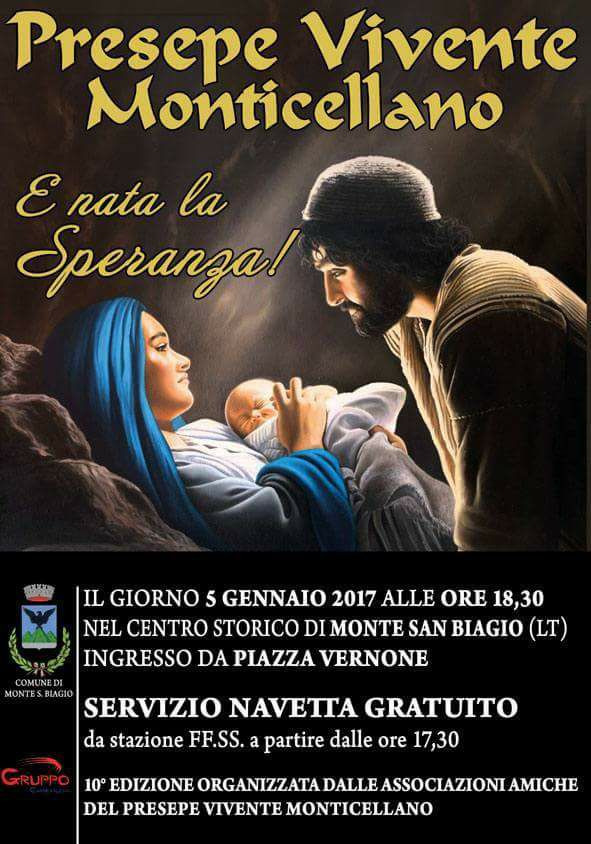 È tutto pronto per il presepe vivente che si terrà giovedì 5 gennaio in piazza Vernone a Monte San Biagio. Poiché è prevista una grande affluenza di pubblico, il Comune ha messo a disposizione una navetta gratuita che si occuperà , a partire dalle 17:30, di portare i visitatori dal parcheggio della stazione fino alla parte alta della cittadina dove sarà inscenata la natività e non solo. Quella del presepe vivente è una tradizione consolidata nella cittadina di Monte San Biagio che si rinnova ormai da 10 anni grazie all'impegno delle associazioni amiche del presepe vivente monticellano.