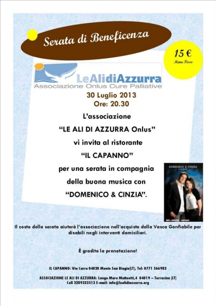 Serata di beneficenza domani alle ore 20:30 presso il ristorante “il Capanno” a Monte San Biagio organizzata dall’associazione ONLUS “Le ali di Azzurra”. L’Associazione nasce l’8 marzo 2012 a Terracina come organizzazione non lucrativa di utilità sociale che si prefigge lo scopo di una diffusa applicazione delle cure palliative nel nostro territorio, a sostegno di una assidua e premurosa assistenza del paziente e delle loro famiglie.