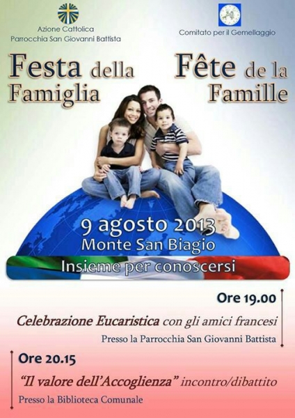 La particolarità di quest’anno è che l’ evento verrà condiviso con i francesi: famiglie di Saint Romain le Puy, paese gemellato con Monte San Biagio, che stanno trascorrendo una settimana ospiti dei loro corrispondenti italiani. Ci sarà, così, la celebrazione eucaristica alle ore 19 in Parrocchia e a seguire il convegno in biblioteca sulle tematiche riguardati la famiglia sia in lingua italiana che in francese, dove interverranno i Presidenti del gemellaggio.