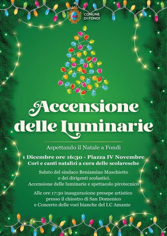 La festa di accensione delle luminarie, che come sempre vedrà protagonisti gli studenti della città, è in programma venerdì 1° dicembre a partire dalle ore 16:30 in Piazza Unità d’Italia. Quando, al termine dei cori, gli alberi dinanzi la chiesa di San Francesco e del Castello Caetani faranno risplendere la piazza, seguirà uno spettacolo pirotecnico. Al termine dei fuochi d’artificio saranno inaugurati i presepi artistici realizzati dal Maestro Marcello Cassoni presso il chiostro di San Domenico.