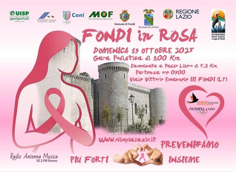 Domenica 19 ottobre 2025 la Città di Fondi si prepara a ospitare la terza edizione di "Fondi in Rosa", un evento di solidarietà che mira a sensibilizzare la collettività sull’importanza della prevenzione contro il tumore al seno e altri tipi di carcinomi e a sostenere le donne che lottano contro il più temibile dei mali. Dopo il successo delle precedenti edizioni (l’edizione 2024 si è conclusa con oltre 400 iscritti), quest'anno l'iniziativa punta a raggiungere un maggior numero di persone e ad amplificare il messaggio.