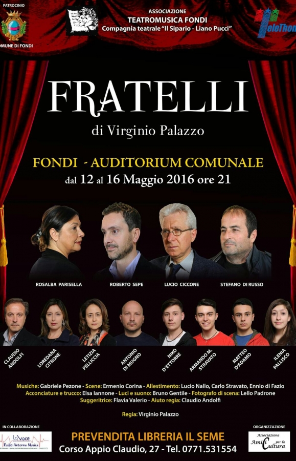 «Una svolta importante nella lunga storia di teatro amatoriale della compagnia “Il Sipario – Liano Pucci”»: così Virginio Palazzo ha definitivo “Fratelli”, la sua ultima commedia che andrà in scena dal 12 al 16 maggio. Ben cinque, dunque, le serate dedicate a questo nuovo lavoro, scritto e recitato in lingua italiana, in programma a partire dalle 21:00 presso l’Auditorium comunale di Fondi. «Fratelli – spiega il regista Virginio Palazzo - rappresenta un cruciale della storia della compagnia. Nato nel 1987, presidente Liano Pucci, appassionato di arte, cultura e spettacolo ma, soprattutto, generoso mecenate, il gruppo di attori oggi si cimenta con una storia contemporanea. I dodici protagonisti-interpreti sono stati scelti per talento e sensibilità dimostrati nei precedenti lavori. Il loro impegno, la straordinaria concentrazione sono per me garanzia di successo e, quello che più conta, soddisfazione per la sfida che hanno accolto». Oltre ai personaggi principali, interpretati da Rosalba Parisella, Roberto Sepe, Lucio Ciccone e Stefano Di Russo, hanno una propria rilevanza anche gli altri otto attori minori, ciascuno con un proprio spessore psicologico e tanti aneddoti divertenti che si intrecciano tra loro.