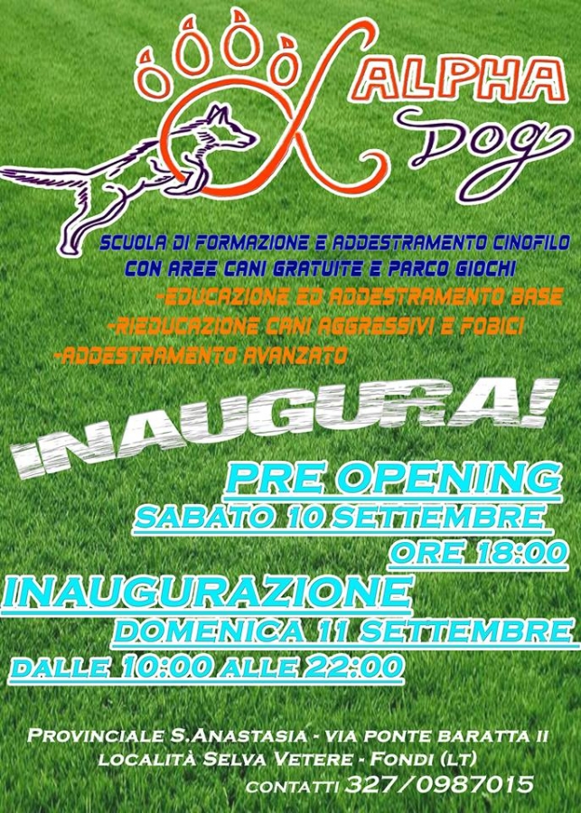 Sarà inaugurato il prossimo 10 settembre alle 18:00, sulla provinciale per S.Anastasia a Fondi, il primo parco per cani. L’accesso all’area, che nasce come centro di addestramento, è gratuito. Ci sono giochi, recinti per gli animali considerati più aggressivi, che non possono solitamente correre in libertà nei giardini o nei luoghi pubblici, e zone in cui far socializzare cani di diverse razze. Alphadog, questo il nome del centro, metterà a disposizione degli ospiti a quattro zampe anche rieducazione per soggetti aggressivi o fobici e corsi di addestramento. Ulteriori info sulla locandina presente nella gallery.