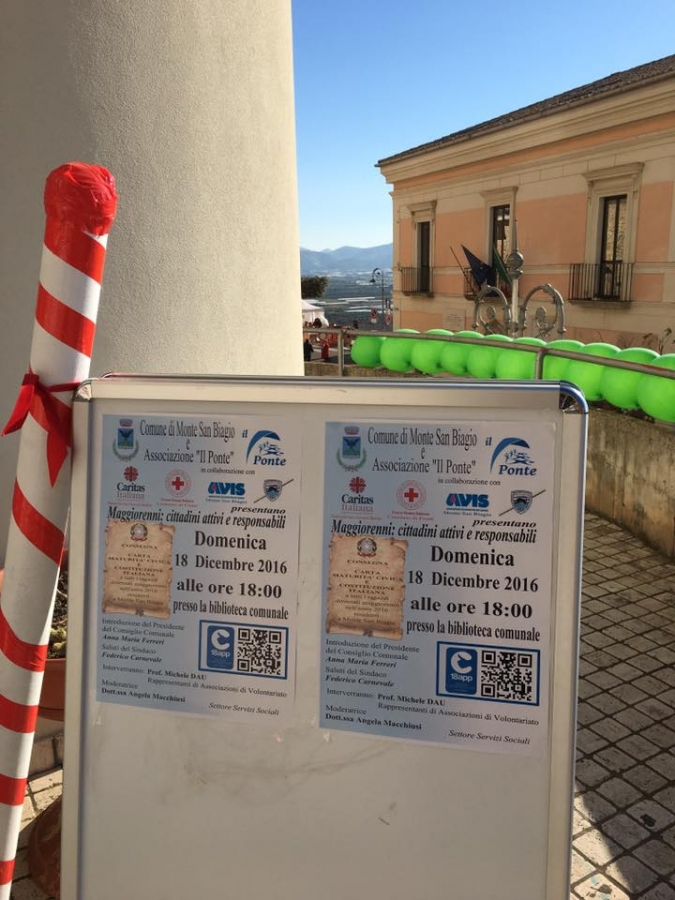 Con una cerimonia ufficiale è stata consegnata ieri a tutti i maggiorenni monticellani dal primo cittadino Federico Carnevale la “Carta di maturità civica”. Oltre al primo cittadino hanno partecipato all’evento, che si è svolto all’interno della biblioteca comunale, anche  il presidente del Consiglio Anna Maria Ferreri e il professor Michele Dau, rappresentante delle associazioni di volontariato.