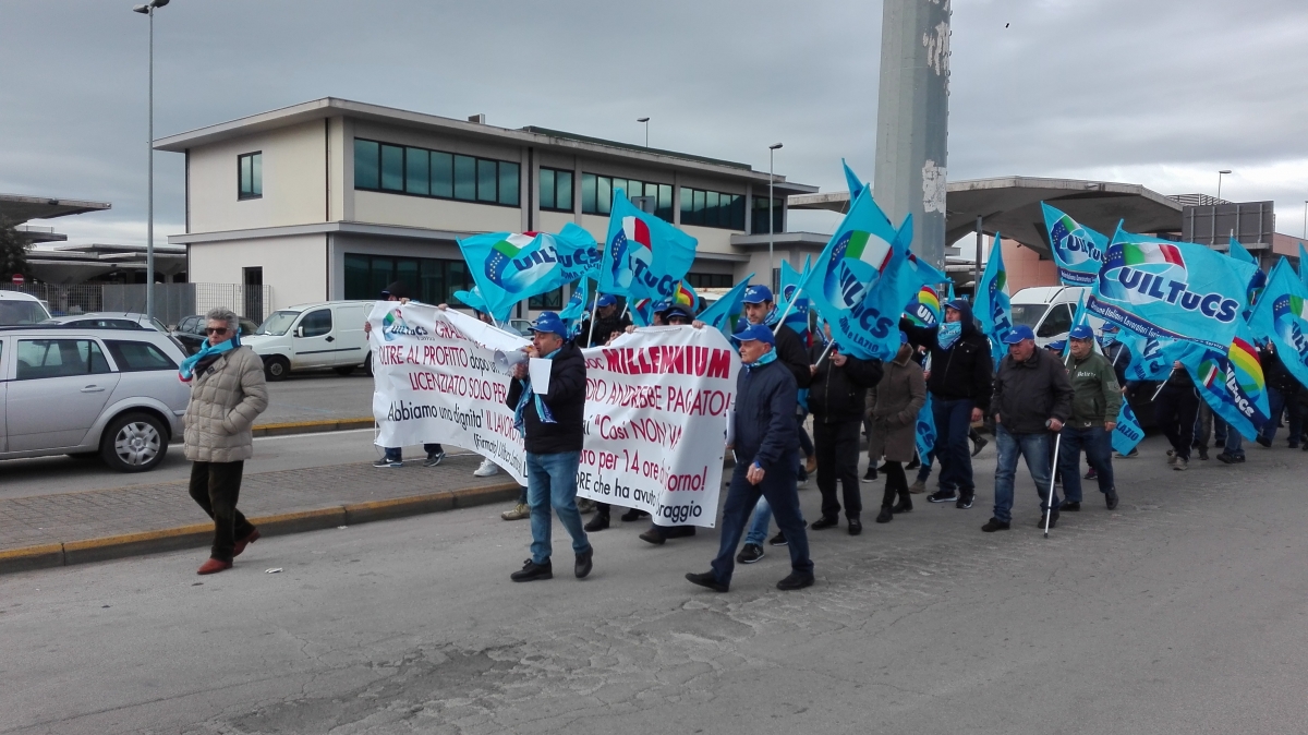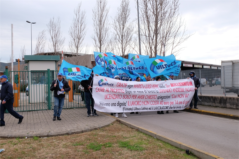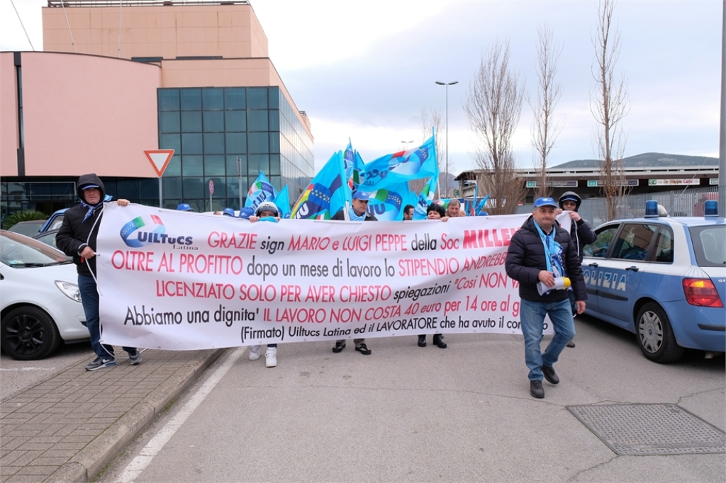 Rumorosa manifestazione questa mattina all'esterno del Mof da parte della Uiltucs di Latina. I sindacalisti hanno trovato tutti gli accessi sbarrati e sono stati costretti a protestare all'esterno. La decisione di organizzare una vera e propria marcia su viale Piemonte è scaturita dal licenziamento di un dipendente della Millennium srl ma si proponeva anche, secondo quanto dichiarato dagli organizzatori, di far aprire gli occhi a quanti subiscono situazioni simili ma restano in silenzio. A seguire la nota integrale della Uiltucs.