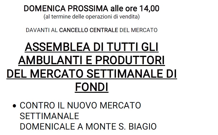 Continua la battaglia di “Imprese Oggi” contro la decisione del Comune di Monte San Biagio di istituire un mercato domenicale che andrebbe a fare concorrenza a quello già esistente da molti anni a Fondi. Nel corso della giornata di ieri è stato distribuito del materiale informativo a tutti gli ambualnti in vista della maxi assemblea in programma il prossimo 26 marzo alle 14:00, al termine delle operazioni di vendita. L'incontro è stato convocato dall'associazione di categoria nata a Fondi anche con altri scopi ovvero parlare della necessaria riduzione del canone cosap e dei diritti di istruttoria e promuovere la realizzazione di tre fiere nella città di Fondi in maniera sinergica e costruttiva. All'assemblea sono stati invitati a partecipare anche gli assessori al commercio dei comuni di Fondi e Monte San Biagio.