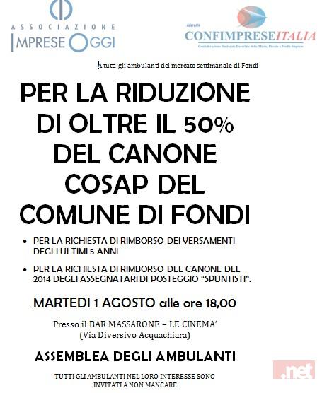 Prosegue la mobilitazione degli ambulanti contro il Canone Cosap del Comune di Fondi dove sono applicate le tariffe più alte della provincia di Latina e tra le più alte d'Italia. Pubblichiamo il testo del volantino che sarà distribuito nei prossimi giorni al mercato settimanale di Fondi nel quale si chiede una riduzione addirittura del 50%. Martedì 1 agosto alle ore 18:00, presso il bar Massarone - Le Cinemà , in via Diversivo Acquachiara, si terrà intanto l'assemblea degli ambulanti convocata da "Imprese Oggi".