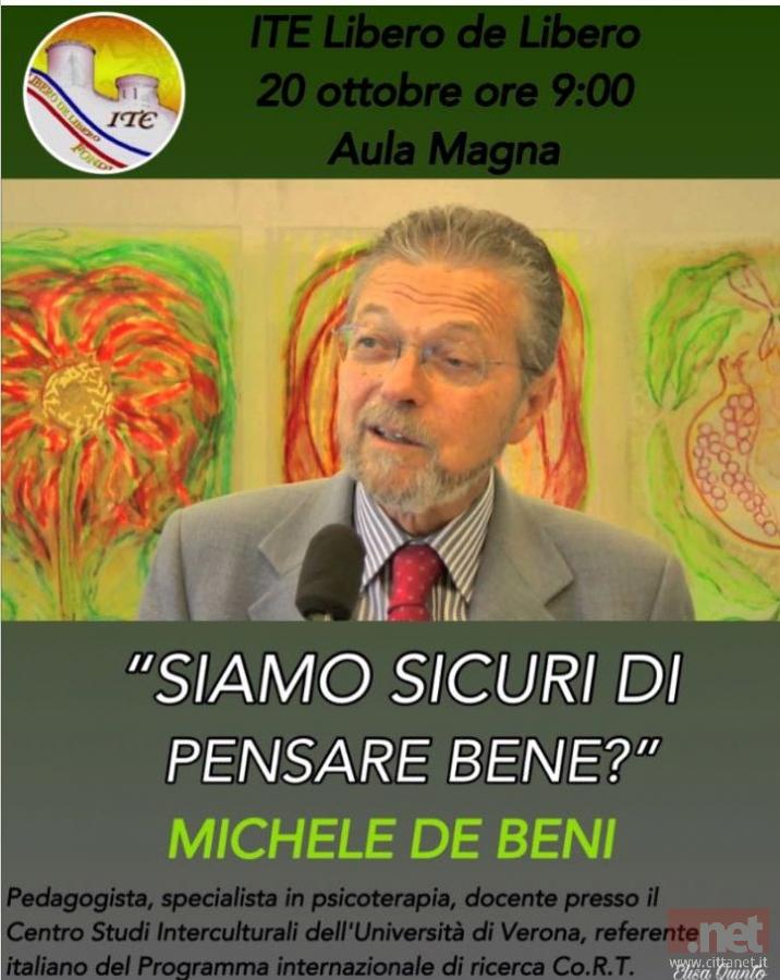 Un altro importante appuntamento attende gli alunni dell'istituto ITE Libero de Libero di Fondi. Il prossimo venerdì 20 ottobre, a partire dalle ore 9 in aula magna, si terra infatti un incontro con Michele De Beni, pedagogista, specialista in psicoterapia, docente presso il Centro Studi Interculturali dell'Università di Verona e referente italiano per il programma internazionale di ricerca Co.R.T.