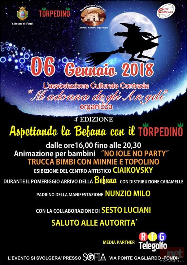 Porterà dolci, caramelle e pomodori, i più squisiti del territorio, la befana organizzata dall'Associazione culturale contrada Madonna degli Angeli di Fondi. Oltre cioccolatini e leccornie di ogni sorta, la vecchiarella in scopa più amata di tutti i tempi donerà infatti anche qualcosa di genuino come il Torpedino naturalmente ai bambini che, naturalmente, dimostreranno di essersi comportati bene. L'appuntamento è in via Ponte Gagliardo, presso la discoteca Sofia Club, a partire dalle ore 16 e fino alle 20:30 del 6 gennaio. Non mancheranno giochi, animazione e tanto divertimento a cura dell'associazione “No Iole no party”. Special guest del pomeriggio, per non tradire le tradizioni dell'esclusivo locale, Minnie e Topolino. Ma non solo perché si terrà anche una speciale esibizione del centro di danza Ciaikovsky. Padrino del pomeriggio il cantattore Nunzio Milo. L'evento, ormai giunto alla sua quarta edizione, è organizzato in collaborazione con Sesto Luciani.