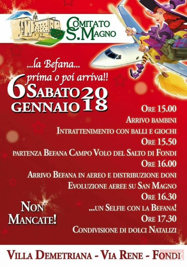 È ormai una tradizione per la contrada di San Magno quella di attendere la Befana che arriva non su una vecchia e sgangherata scopa ma su un piccolo e spettacolare aereo. La vecchiarella in versione moderna sorvolerà la frazione a partire dalle 15:00 del prossimo 6 gennaio e lancerà dolci e doni a tutti i bimbi presenti. Ma non è tutto perché dopo essersi liberata del carico di dolciumi, compirà delle spettacolari evoluzioni aeree lasciando a bocca aperta grandi e piccini. Alle 16:00 la befana scenderà a terra e si farà fotografare con tutti i bambini per un selfie ricordo. La manifestazione, che interesserà Villa Demetrana e via Rene, si concluderà alle 17:30 con la condivisione dei dolci natalizi. Il Comitato San Magno, organizzatore dell'evento, invita grandi e piccoli ad accorrere numerosi a partire dalle 15:00, orario in cui avrà inizio musica, baby dance, intrattenimento e molto altro.