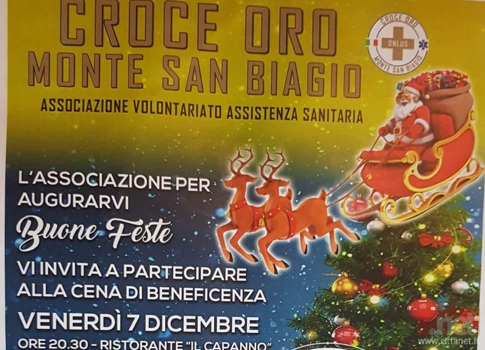 L'associazione di volontariato e assistenza sanitaria Croce Oro di Monte San Biagio invita la cittadinanza a partecipare alla Cena di Beneficenza che si terrà venerdì 7 dicembre alle 20:30 al ristorante “Il Capanno”.