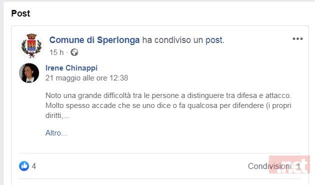 Così la delegata alla comunicazione del Comune di Sperlonga Irene Chinappi sulla pagina istituzionale dopo le richieste risarcimento per danno di immagine avanzate da parte dell'Ente.