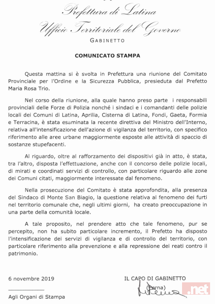 I furti non sono aumentati né in rapporto ai mesi precedenti né in rapporto agli altri territori ma i controlli saranno intensificati perché la sicurezza rappresenta un dovere che le istituzioni hanno nei confronti dei cittadini. E' quanto emerso dal vertice sulla sicurezza che si è tenuto in Prefettura alla presenza del sindaco di Monte San Biagio Federico Carnevale, dei comandanti di tutte le forze dell'ordine, in particolare di Terracina, Fondi, Gaeta e Formia e, naturalmente, del prefetto Maria Rosa Trio. La riunione del comitato provinciale per l'ordine e la sicurezza pubblica è stato anche una preziosa occasione per parlare della recente direttiva del ministero dell'interno che ha chiesto l'intensificazione dei controlli su tutto il territorio per prevenire il fenomeno dello spaccio.