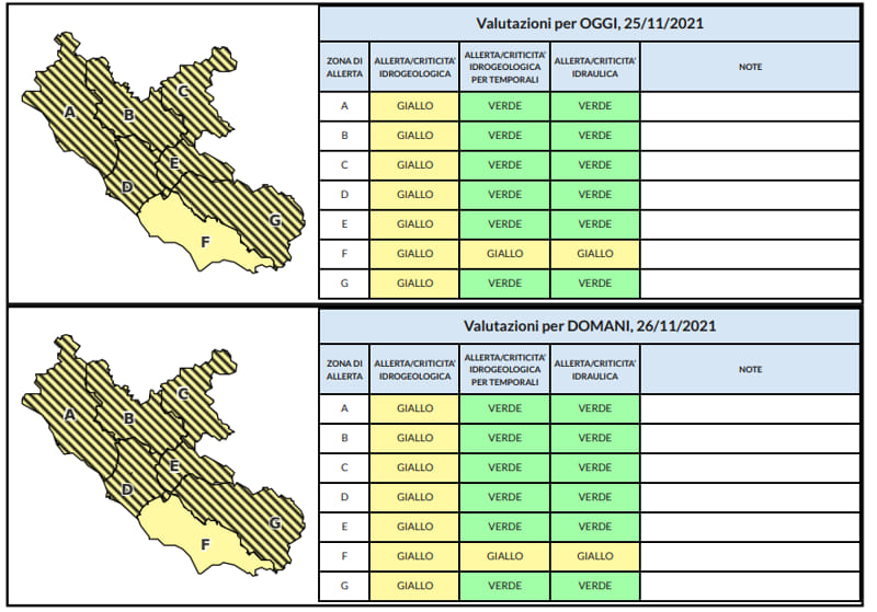 Sulla base delle Previsioni Meteo per il Lazio emesse in data odierna dal Dipartimento della Protezione civile, tenuto conto che nelle ultime 24 ore sono state registrate precipitazioni con quantitativi cumulati deboli sui bacini costieri afferenti al territorio della Regione Lazio, e considerato l’Avviso di Condizioni Meteorologiche Avverse N°21105 del 24/11/2021 per la Regione Lazio, è in corso un allerta Meteo Gialla per i Bacini costieri Sud per 24/36 ore per criticità idrogeologica ed idraulica e per criticità idrogeologica per temporali.
