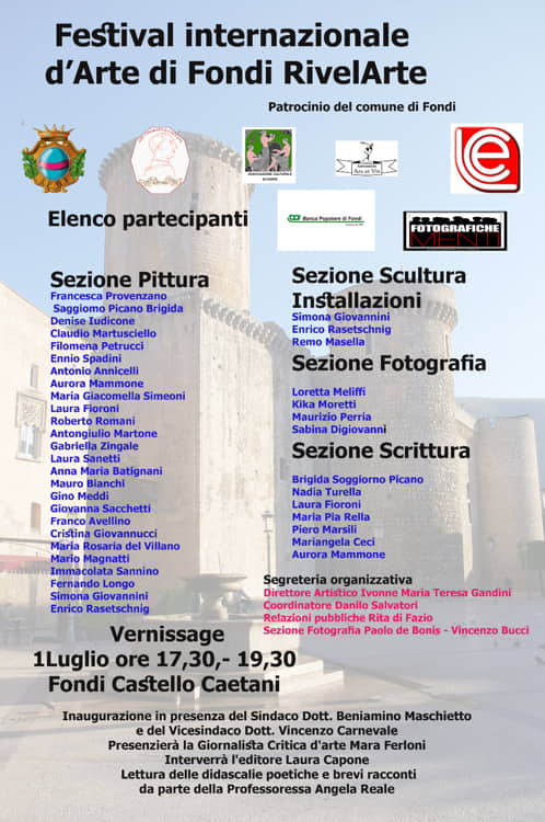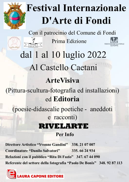 Pittura, scultura, installazioni, fotografia, didascalie poetiche e brevi racconti: sarà un tripudio di espressioni artistiche il primo Festival internazionale d’arte di Fondi RivelArte che si terrà al Castello dal 1° al 10 luglio. Il taglio del nastro è previsto alle 17:30 del prossimo venerdì quando, nel corso di una prestigiosa cerimonia, sarà presentato il progetto che ambisce a promuovere talenti artistici e ad attrarre in città amanti dell’arte in tutte le sue espressioni.