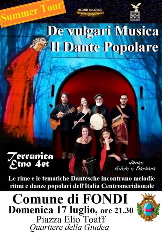 Fa tappa anche a Fondi “De vulgari musica – Il Dante popolare”, spettacolo a cura di Terrunica Etno 4et, in collaborazione con il Sistema Bibliotecario Sud Pontino, Blond Records e il patrocinio del Comune di Fondi. Dopo il grande successo di pubblico riscosso a Lenola, il gruppo di artisti andrà in scena a Fondi, in piazza Elio Toaff, nel quartiere della Giudea, il 17 luglio a partire dalle 21:30.