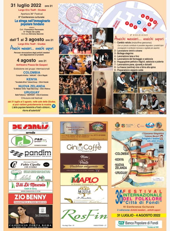 A creare l’atmosfera giusta, il fascino senza tempo dei vicoli del centro storico e i palazzi del quartiere ebraico medievale della città, noto per essere uno dei meglio conservati d’Europa. Momento clou dell’evento sarà l’attesa esibizione dei gruppi internazionali, in programma il 4 agosto alle ore 21:00 in piazza Alcide De Gasperi. Dal 31 luglio al 3 agosto sarà inoltre possibile visitare, gratuitamente, nei locali della Giudea, l’esposizione “L’abito popolare femminile a Fondi e dintorni… ritorno all’autenticità”.