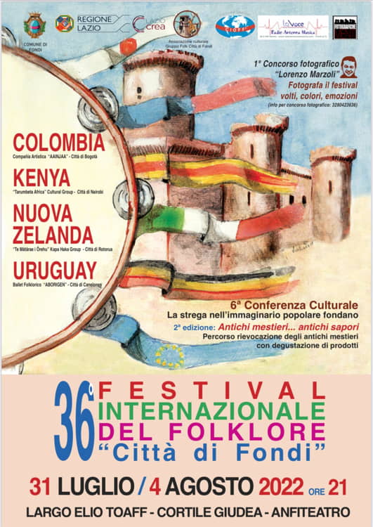 Con il venire meno delle restrizioni, il Festival torna ad essere a tutti gli effetti un momento di cultura popolare, danza e incontri. Grandi ospiti della 36esima edizione del Festival saranno, infatti, la Colombia, con la compagnia artistica “Aainjaa”, direttamente da Città di Bogotà, il Kenya, con il gruppo culturale “Tarumbeta Africa” di Nairobi, la Nuova Zelanda, con “Te Mātārae i ŌREHU” Kapa Haka Group direttamente da Rotorua e il ballet Folklorico “Aborigen” dall’Uruguay. Non mancherà, naturalmente, l’esibizione del Gruppo Folk Città di Fondi, da 36 anni organizzatore dell’evento e ambasciatore di fondanità nel mondo. Contestualmente si svolgerà il 1° Concorso fotografico “Lorenzo Marzoli”, intitolato “Fotografa il festival: volti, colori, emozioni” che darà la possibilità a tutti gli amanti del settore di immortalare i momenti più suggestivi del festival con macchine professionali e smartphone. Per ulteriori informazioni sul concorso è possibile contattare il numero 3280423636.