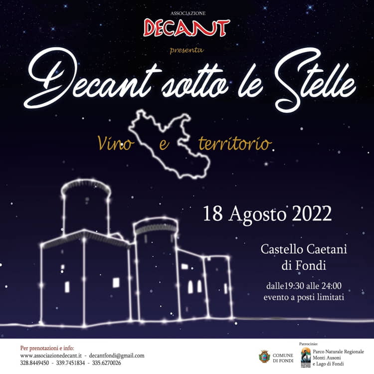 L’evento, organizzato dall’Associazione Decant e dedicato ai vini e alla gastronomia del Lazio, si svolgerà sulla terrazza del Castello Caetani di Fondi giovedì 18 agosto.