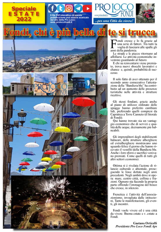 È stato pubblicato a cura dell'Associazione Pro Loco Fondi Aps, in collaborazione con il Comune di Fondi, "Speciale Estate" 2022.