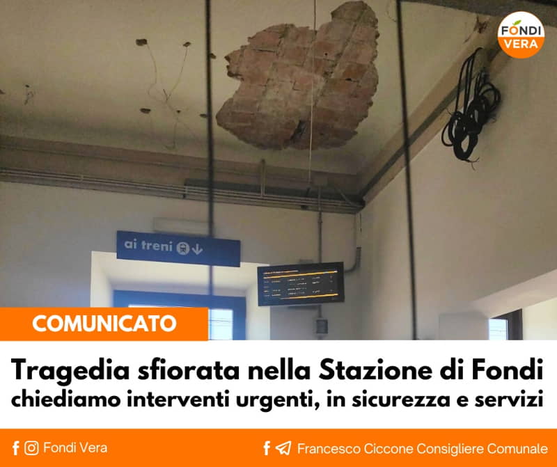 La notizia del crollo di una parte di controsoffitto e intonaco all’interno della sala d’attesa della Stazione di Fondi è passata quasi inosservata. Eppure “la Stazione” per una Città turistica è il più importante biglietto da visita, la prima percezione che ha un turista del luogo in cui ha scelto di trascorrere le proprie vacanze.