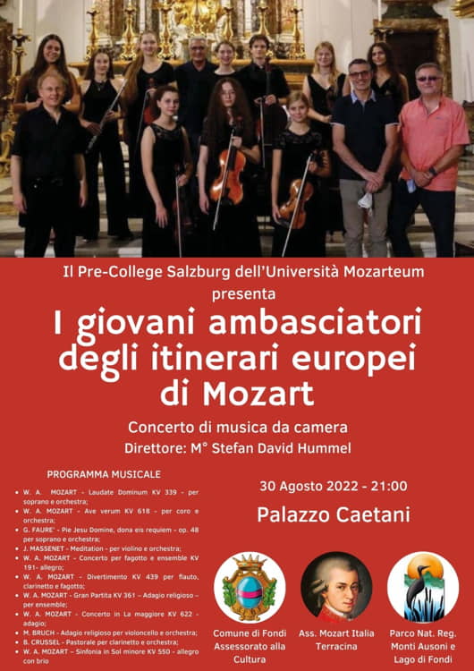 Protagonisti della serata saranno gli straordinari musicisti del Pre-College Salzburg dell’Università Mozarteum, accompagnati e diretti dal famoso Maestro Stefano David Hummel. Oltre la metà dei brani del repertorio omaggeranno il compositore austriaco ma non mancheranno opere di Crussell, Bruch, Fauré e Massenet. L’evento è organizzato dall’Associazione Mozart Italia di Terracina, presieduta dal Maestro Bruno Di Girolamo, con il patrocinio del Comune di Fondi e del Parco Naturale Regionale dei Monti Ausoni e Lago di Fondi.