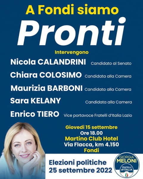 Il 15 settembre ci sarà la presentazione dei nostri candidati presso il Martino Club (lungo il litorale fondano), dove avremo modo di approfondire diversi aspetti del nostro programma grazie alla presenza del Senatore Calandrini, dell’On. Chiara Colosimo, della Dott.ssa Maurizia Barboni, dell'Avv. Sara Kelany e del vice coordinatore regionale Enrico Tiero.