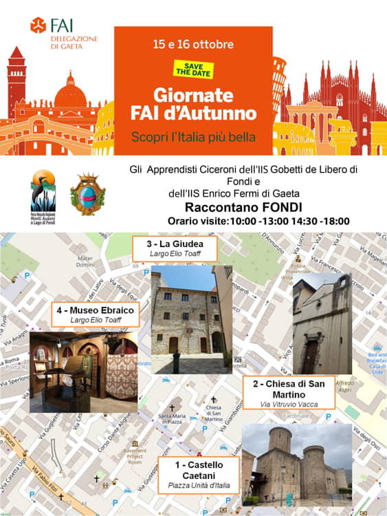 Quest’anno si terranno a Fondi le giornate FAI promosse dalla delegazione di Gaeta del Fondo per l’Ambiente italiano. Il weekend del 15 e del 16 ottobre apriranno al pubblico alcuni monumenti simbolo della città ma anche gemme nascoste che solitamente non è possibile visitare. Il tour, messo a punto dal team del FAI in collaborazione con il Comune di Fondi e il Parco Naturale regionale Monti Ausoni e Lago di Fondi, partirà dal Castello con il suo Museo Civico e la terrazza panoramica, toccherà Palazzo Caetani con il suo passetto, si sposterà presso la chiesa di San Martino e raggiungerà il quartiere ebraico attraverso i suggestivi vicoli del centro storico fondano. Alla Giudea sarà possibile visitare, oltre al cortile, il giardino, un appartamento dove sarà proiettato un video sulla città di Fondi e il museo ebraico. A fare da Ciceroni, come da tradizione del FAI, saranno gli studenti del distretto, in particolare dell’IIS Gobetti-De Libero di Fondi e dell’IIS E. Fermi di Gaeta