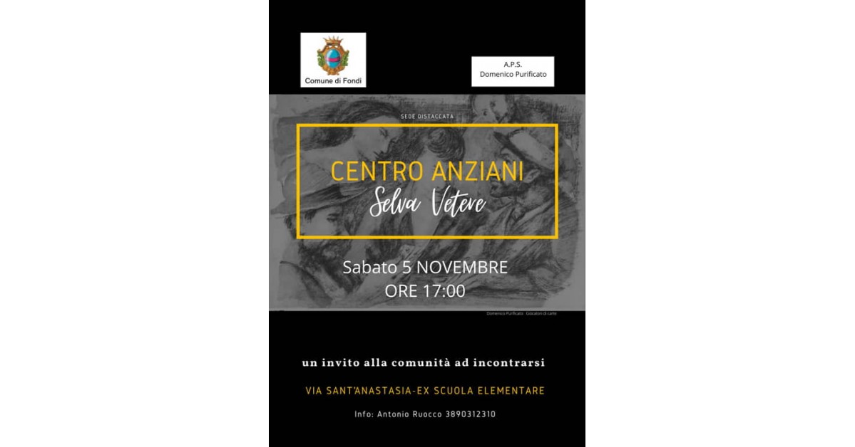Dal prossimo sabato il centro anziani “Domenico Purificato” avrà una nuova sede distaccata in località Selva Vetere. La succursale, fortemente voluta dai residenti della contrada spesso in difficoltà per motivi di distanza a frequentare le attività della struttura in Piazza IV Novembre, prenderà forma nella ex scuola elementare, al civico 2392 di via Sant’Anastasia. Come consentito dal regolamento approvato in Consiglio comunale, che prevede la possibilità di aprire sedi distaccate, l’amministrazione, di concerto con i vertici del centro anziani e i residenti, ha ritenuto opportuno offrire un servizio agli anziani della popolosa frazione.