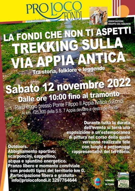 L'Associazione Pro Loco Fondi Aps, in collaborazione con l’Associazione Il Drappo Dell'assunta  e con il patrocinio del Comune di Fondi  e del Parco Naturale dei Monti Aurunci ha organizzato per sabato 12 novembre 2022 l'evento: "LA FONDI CHE NON TI ASPETTI - TREKKING SULLA VIA APPIA ANTICA TRA STORIA, FOLKLORE E LEGGENDE”.