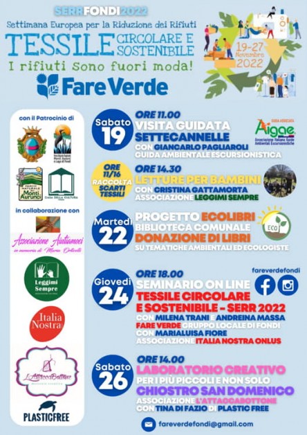 L'Edizione 2022 della "Settimana Europea per la Riduzione dei Rifiuti", che avrà luogo dal 19 al 27 Novembre, si concentrerà sul tessile per evidenziare il forte impatto che ha sul nostro Pianeta ma soprattutto per ispirare azioni che porteranno una maggiore circolarità nel settore tessile. Il Gruppo Locale di Fare Verde Fondi ha in cantiere una serie di iniziative con cui aderire alla "European Week for Waste Reduction" che inizieranno Sabato 19 e si concluderanno Sabato 26 Novembre.