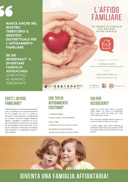 Prosegue la campagna di informazione e sensibilizzazione promossa dal Distretto Socio sanitario LT4 di cui il Comune di Fondi è capofila. Dopo la pubblicazione di un avviso pubblico senza scadenza per il reclutamento delle famiglie, le città interessate si stanno infatti impegnando per far conoscere alla collettività le tipologie e le modalità di affidamento esistenti.