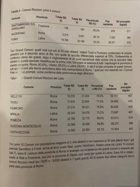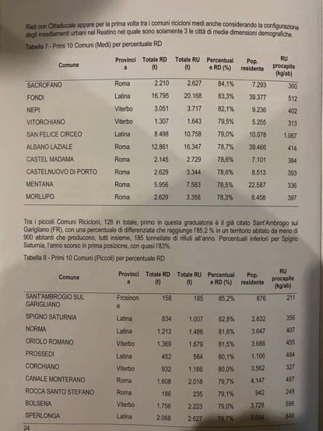 Per quanto riguarda la classifica assoluta dei comuni laziali, Fondi conserva il suo terzo posto, come lo scorso anno; escono dunque Spigno Saturnia e Norma ed entrano i piccoli comuni di Sant’Ambrogio sul Garigliano, con i suoi 876 abitanti e una percentuale di differenziata dell’85,2% e Sacrofano, con i suoi 7923 residenti e una quantità di differenziata dell’84,1%.