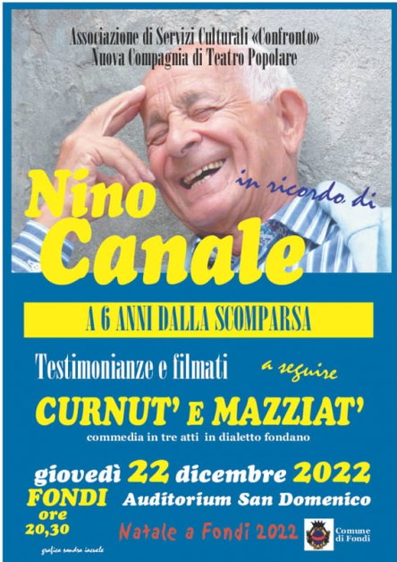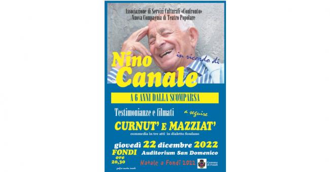 Nell'ambito del calendario delle manifestazioni natalizie organizzate dal Comune di Fondi, giovedì 22 dicembre alle ore 20:30, presso l'Auditorium comunale “Sergio Preti”, si terrà un evento in memoria di Nino Canale. Il 24 dicembre ricorre infatti il 6° anniversario dalla scomparsa dell’amato concittadino, classe 1938 e una vita trascorsa a rubare sorrisi e momenti di spensieratezza alla città. Nel corso della serata si susseguiranno testimonianze, con relativi filmati sull'attività artistica dell'attore e regista fondano. Nino Canale può considerarsi il decano del teatro popolare: ha infatti portato in scena decine di commedie in dialetto fondano, facendo recitare centinaia di provetti attori.
