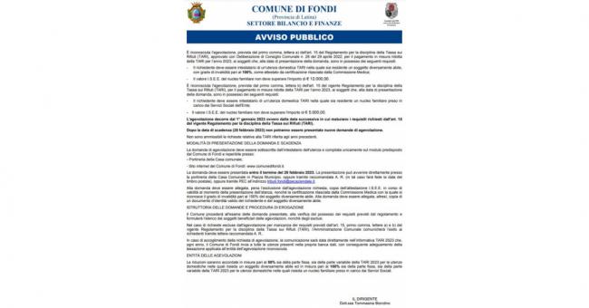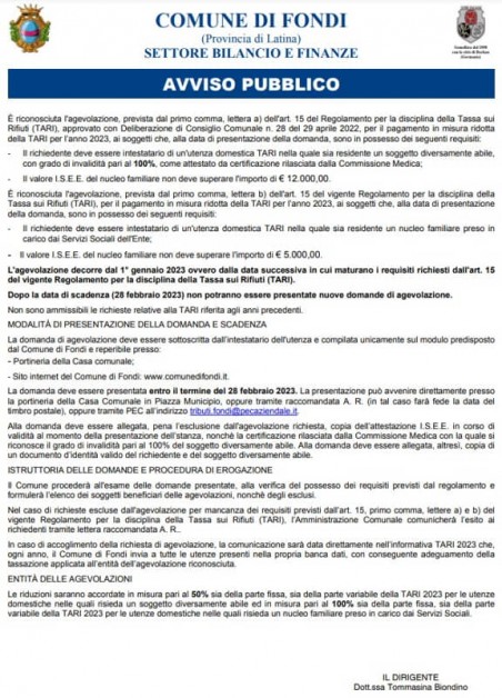 È stato pubblicato sull’Albo pretorio del Comune di Fondi un avviso pubblico per richiedere le agevolazioni Tari nei seguenti casi: