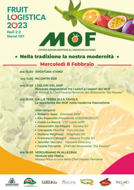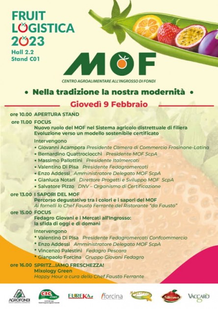 Il programma della tre giorni berlinese prenderà il via mercoledì 8 febbraio con l’apertura dello stand fissata per le 10 del mattino, seguita da incontri B2B, per poi concentrarsi alle 13 su “I Colori del MOF”, il percorso degustativo che conterà sulla presenza ai fornelli dello chef Fausto Ferrante del ristorante “Da Fausto”. A seguire, alle 15, il seminario “Dalla terra alla tavola – Le eccellenze del Mof nella moderna ristorazione”, con importanti ospiti e relatori tra i quali il direttore del Centro Agroalimentare all’Ingrosso di Fondi, Roberto Sepe. Giovedì un’altra giornata ricca di eventi, a cominciare dal focus “Nuovo ruolo del MOF nel sistema distrettuale agricolo di filiera – Evoluzione verso un modello sostenibile certificato”, al quale prenderanno parte il presidente di Italmercati, Fabio Massimo Pallottini, il presidente di Fedagromercati, Valentino Di Pisa, per DNV – Organismo di Certificazione, Salvatore Pizzo, il presidente della Camera di Commercio di Latina-Frosinone, Giovanni Acampora, il presidente del MOF, Bernardino Quattrociocchi, ed Enzo Addessi, amministratore delegato del Centro Agroalimentare all’Ingrosso di Fondi. Alle 15 il focus “Fedagro Giovani e i mercati all’ingrosso: la sfida di oggi e di domani”, per chiudere la giornata alle 16 con “Spritz…. Iamo freschezza”. La giornata di venerdì, infine, inizierà alle 10 con l’apertura dello stand, poi un momento dedicato agli incontri B2B, per poi concentrarsi sul cibo con “I colori dell’Italia” e chiudere la tre giorni con i saluti e l’arrivederci alla prossima edizione della manifestazione fieristica più importante del settore ortofrutticolo internazionale.  Ad accompagnare MOF nella tre giorni berlinese il know how e le eccellenze di: Agrofondi, AOP Csc Lazio, Eureka, Forcina Marco, Magliozzi, Silvana Frutta, Vaccaro.