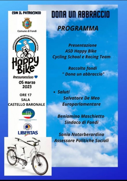 L’evento è organizzato dalla Asd Happybike, anche Cycling School e Racing Team. Contestualmente al pomeriggio partirà una raccolta fondi denominata “Dona un abbraccio”. Sarà presente alla presentazione dell’iniziativa anche l’eurodeputato Salvatore De Meo.