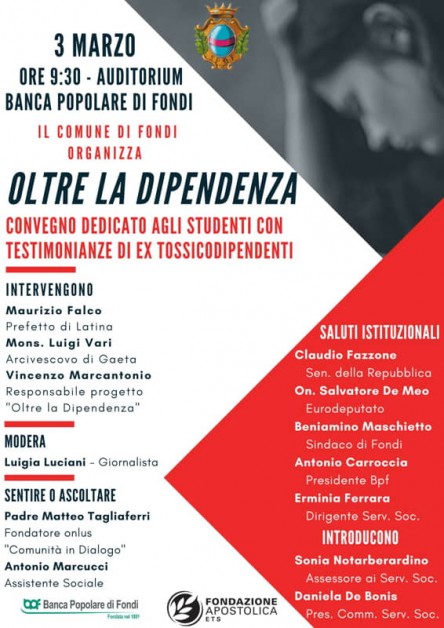 Se ne parlerà venerdì 3 marzo, alle ore 9:30, presso l’auditorium della Banca Popolare di Fondi, nell’ambito del convegno “Oltre la Dipendenza”: un’intera mattinata dedicata agli studenti delle scuole superiori della città. Oltre alla straordinaria presenza del Prefetto di Latina Maurizio Falco e dell’arcivescovo di Gaeta, monsignor Luigi Vari, prenderanno la parola una serie di relatori che, per motivazioni personali o professionali, hanno vissuto e vivono intimamente l’esperienza della dipendenza. Tra i momenti più d’impatto della mattinata, ci saranno le testimonianze di ex tossicodipendenti che racconteranno come sono usciti dal meraviglioso pianeta dei ragazzi per finire nel drammatico mondo della droga. Conoscere per prevenire, dunque, ma anche sensibilizzare e riflettere con maturità e consapevolezza. A moderare il convegno ricco di spunti e interventi, la giornalista Luigia Luciani.