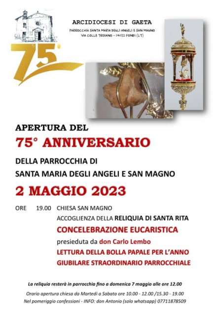 Martedì 2 maggio alle ore 19.00 si terrà l’apertura dell’anno giubilare straordinario della parrocchia di Santa Maria degli Angeli e San Magno di Fondi, in occasione dei 75 anni di fondazione. L’anniversario si aprirà con l’arrivo della reliquia di Santa Rita da Cascia nella comunità parrocchiale, una concelebrazione eucaristica presieduta da don Carlo Lembo e la lettura della bolla papale per l’anno giubilare straordinario parrocchiale.