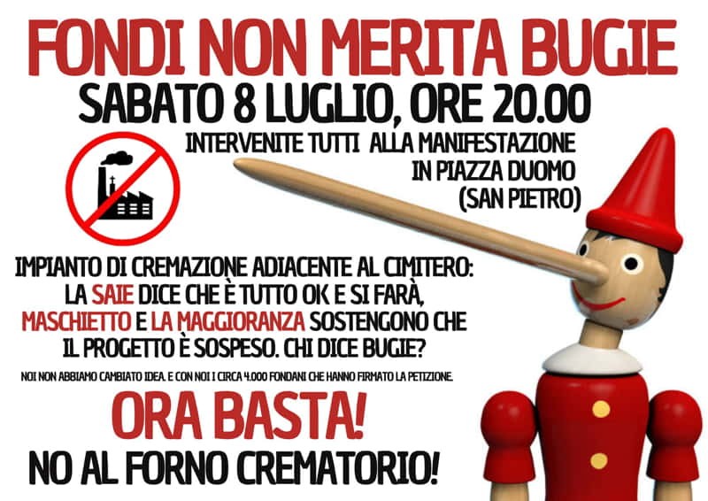 Dopo la campagna pubblicitaria della Saie che ha raggiunto l'apice con la distribuzione di un opuscolo di pura propaganda a 18.000 famiglie fondane, il Comitato No al forno crematorio di Fondi ritorna a manifestare con forza il proprio dissenso alla costruzione di un impianto crematorio nella Città.