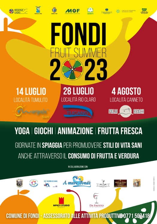 Dopo il successo delle precedenti edizioni torna a gran richiesta il “Fondi Fruit Summer 2023”, l'iniziativa organizzata dal Comune di Fondi, in collaborazione con il Mof, per promuovere le corrette abitudini alimentari, l'importanza del consumo di ortofrutta, lo sport e il benessere psicofisico. Anche quest'anno gli eventi, tutti gratuiti, si terranno sul litorale fondano allo scopo di coinvolgere i cittadini ma anche i numerosissimi turisti che stanno affollando spiagge e lidi.