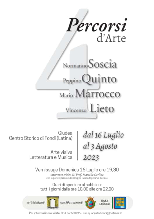 L'Associazione "Il Quadrato Fondi - APS" ha il piacere di presentare "Percorsi d'Arte", Mostra di Pittura e Scultura che si terrà a Fondi dal 16 Luglio al 3 Agosto, nella suggestiva location della Giudea. Con quattro artisti del territorio che hanno raccolto l'invito dell'Associazione presieduta da Francesco Giorgio. Evento che gode del Patrocinio del Comune di Fondi.