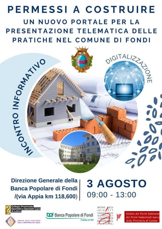 L'incontro informativo si terrà presso la Direzione Generale della Banca Popolare di Fondi (via Appia lato Monte San Biagio km 118,600), dalle 9:00 alle 13:00, e gode del patrocinio degli Ordini degli Architetti, degli Ingegneri e del Collegio provinciale Geometri e Geometri Laureati della provincia di Latina.