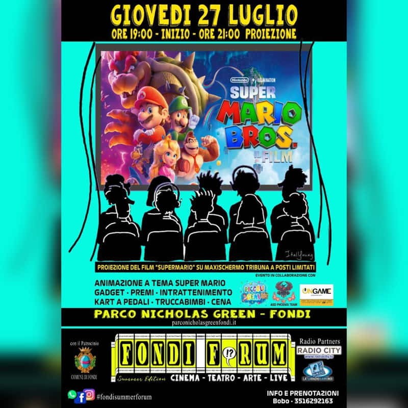 Le associazioni ItalYoung e Phoenix Team, nel contesto della programmazione estiva “Fondi sotto le stelle”, sono particolarmente entusiaste di presentare l'evento in programma per il 27 luglio ore 21.00 che vedrà la proiezione del film "Super Mario Bros." su maxischermo, grazie all'utilizzo della tribuna del parco. L'evento sarà arricchito da animazioni a tema Super Mario curate da Piccoli Geni Fondi, con trucco per i bambini e una mini-gara con i Kart a pedali.