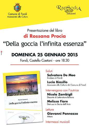 Domenica 25 Gennaio 2015 alle ore 18.30 nella sala convegni del Castello Caetani avrà luogo la presentazione del libro di poesie di Rossana Procia “Della goccia l’infinita essenza” (Rapsodia edizioni, 2014) alla presenza dell’autrice. L’iniziativa è promossa dal Comune di Fondi in collaborazione con Rapsodia edizioni.
