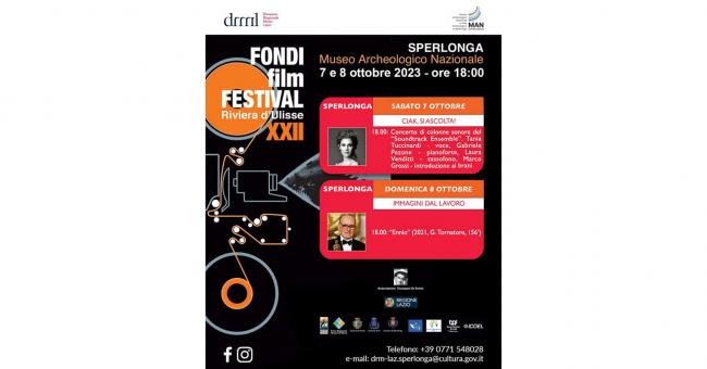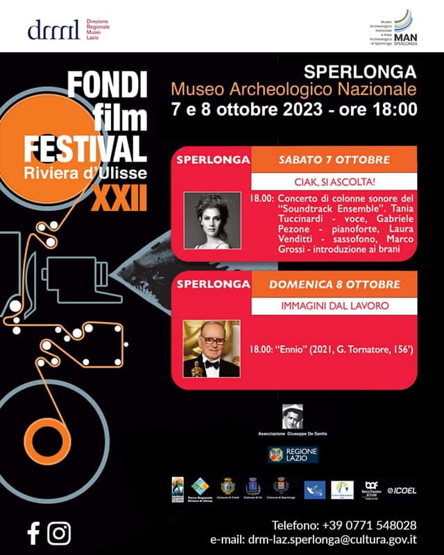 Doppio appuntamento nel prossimo fine settimana al Museo Archeologico Nazionale di Sperlonga per il FONDIfilmFESTIVAL - Riviera d’Ulisse XXII: sabato 7 ottobre il Concerto di colonne sonore del Soundtrack Ensemble “CIAK, SI ASCOLTA!”, domenica 8 la proiezione dell’emozionante film “Ennio” (Giuseppe Tornatore, 2021), ritratto a tutto tondo di Ennio Morricone, il musicista più popolare e prolifico del XX secolo, il più amato dal pubblico internazionale, due volte Premio Oscar, autore di oltre 500 indimenticabili colonne sonore.