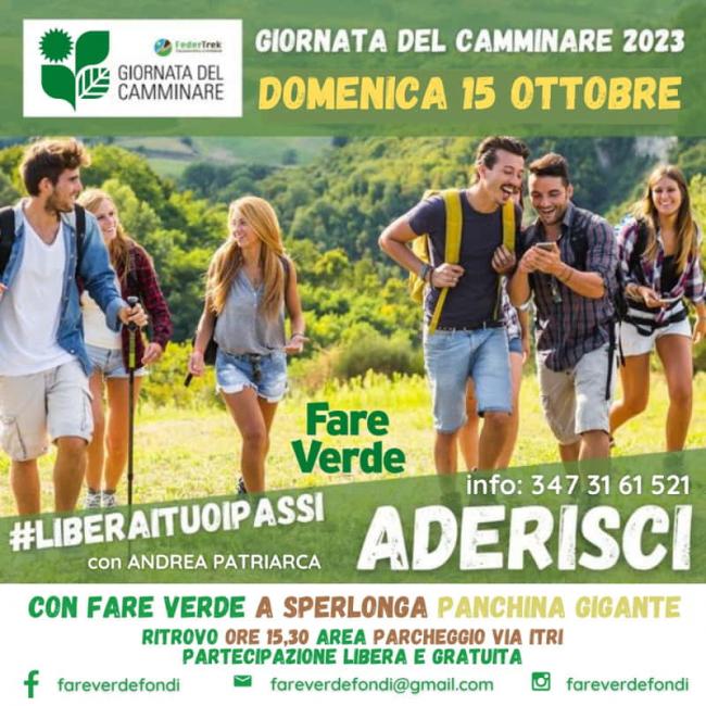 Anche quest'anno siamo pronti per la Giornata del Camminare FederTrek. L'Edizione 2023 ci vedrà impegnati Domenica 15 Ottobre, in compagnia della Guida Ambientale Escursionistica Andrea Patriarca in quel di Sperlonga. Il Gruppo Locale di Fondi dell'Associazione Ambientalista Fare Verde, presieduto da Milena Trani, invita tutti a partecipare alla Camminata di Domenica 15 Ottobre.