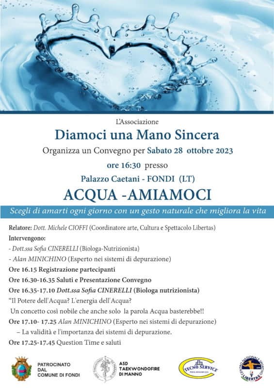 Si terrà Sabato 28 Ottobre, presso Palazzo Caetani a Fondi, a partire dalle 16.30, un convegno patrocinato dal Comune di Fondi, fortemente voluto dall'Associazione "Diamoci una mano sincera". L'incontro vedrà la partecipazione dello Scrittore e Aforista Italiano Michele Cioffi.